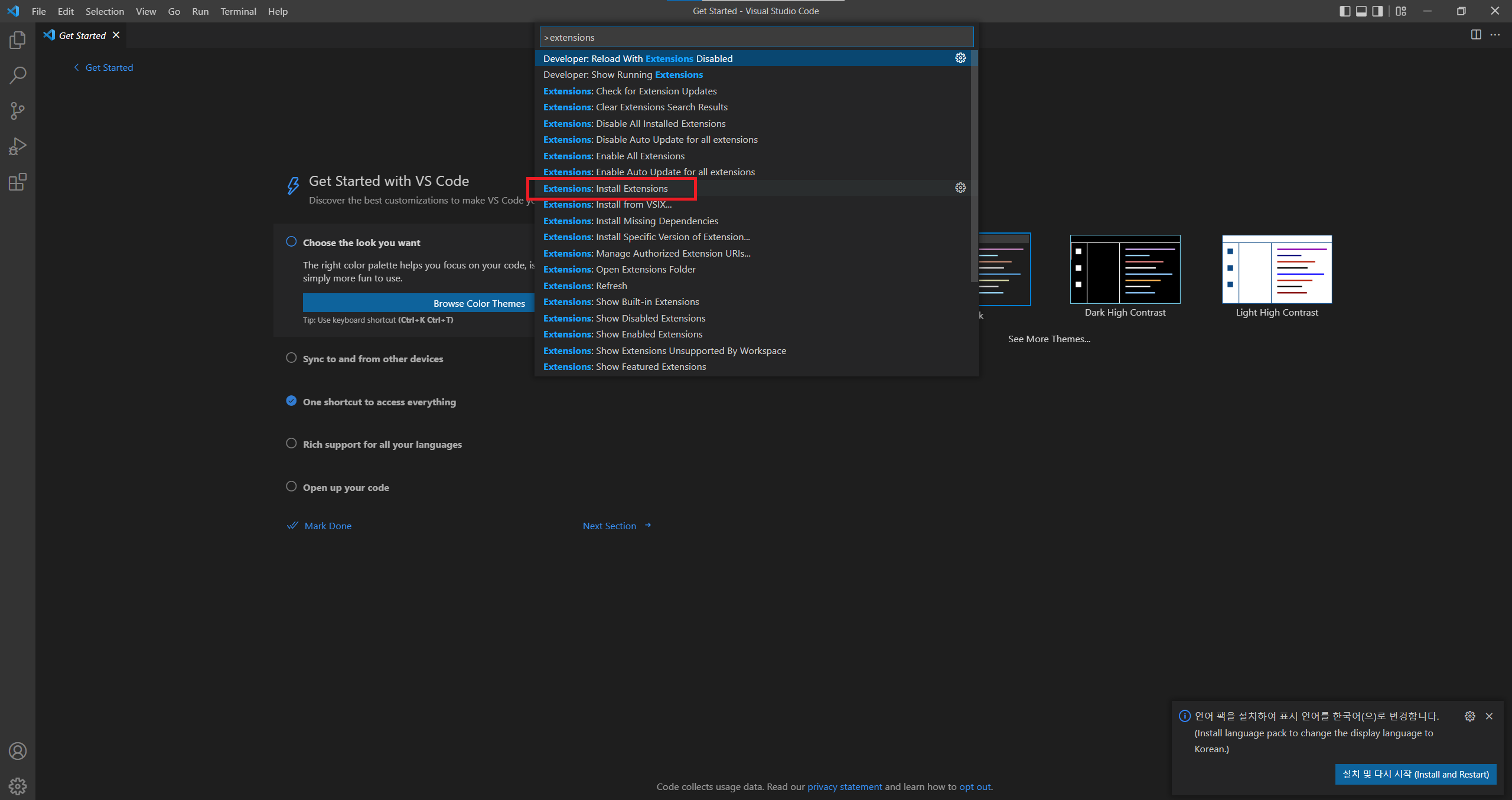 extensions를 검색해보면 아래와 같이 Extensions: Install Extensions 를 찾을 수 있습니다.