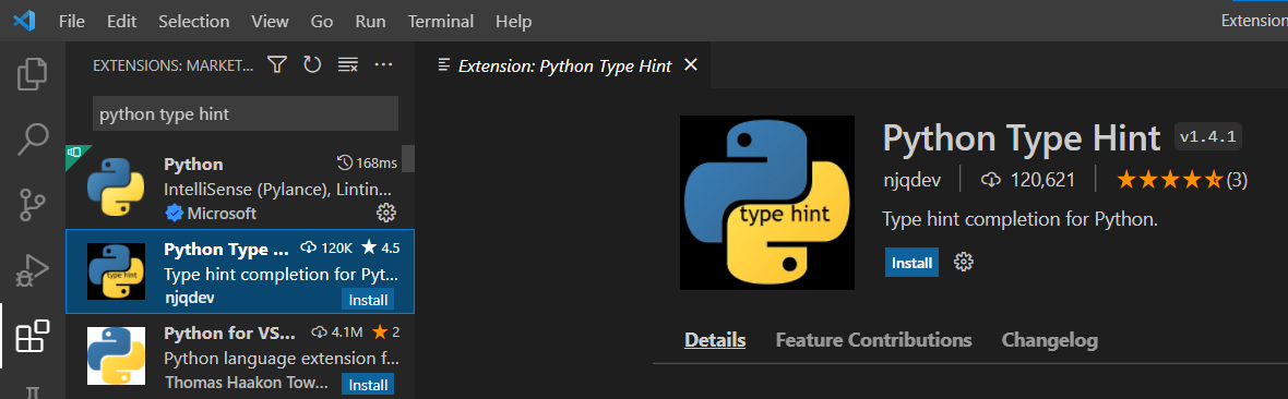 각각의 Extension을 눌러보면 아래에 설명이 자세하게 나와있습니다. Python Type Hint의 경우는 말그대로 어떤 타입인지에 대해 힌트를 아래에 보여줘서 코딩하기 쉽게 해주는 기능을 합니다.