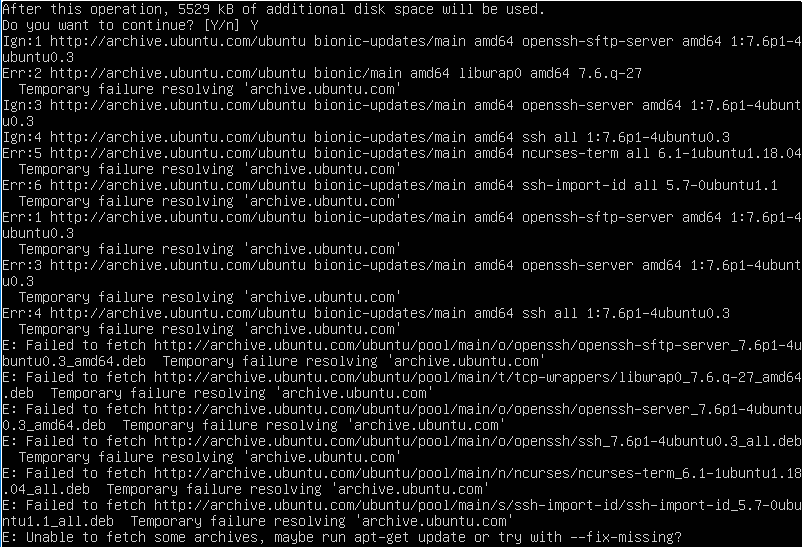 처음 설치시 ssh 설정을 하지 않았기 때문에 apt-get update 후 apt-get install ssh를 하려고 했다.