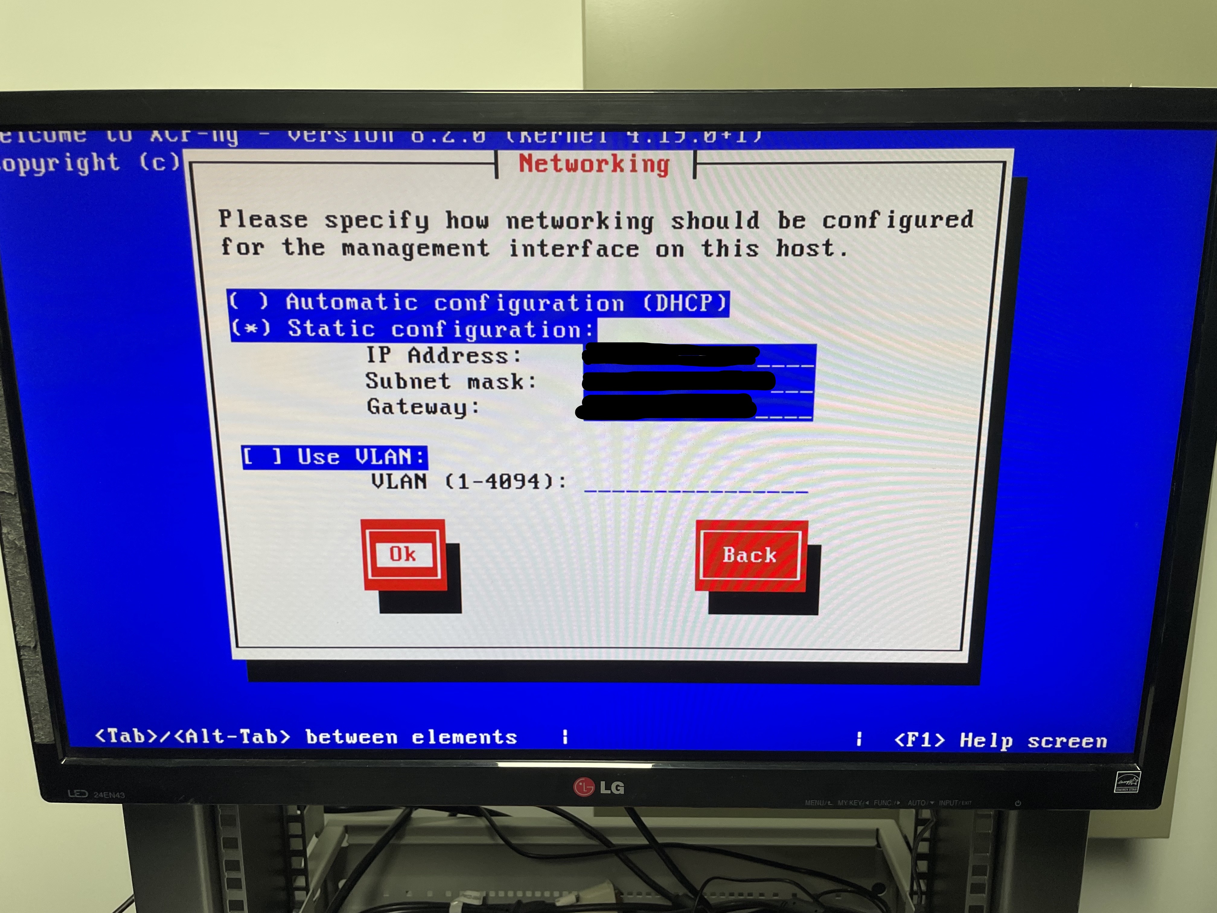 처음 실행하면 XCP-ng Setup이 나타납니다. Ok를 누릅니다.