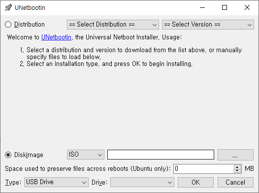 첫화면이 아래와 같은데요. DiskImage 선택 후 위에서 받은 ISO를 넣습니다. 그리고 USB Dirve Type으로 OK를 누르면 됩니다.