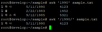 // 사이에 패턴을 입력하면 해당 내용을 포함하고 있는 라인만 출력됩니다.