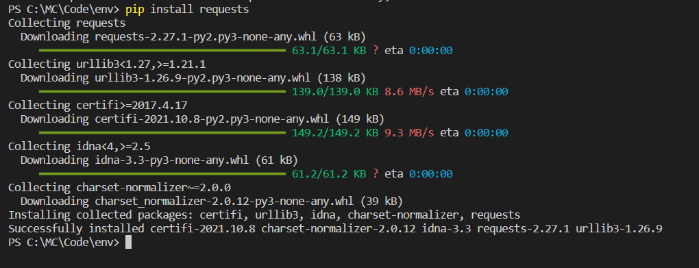 아까 설치 못한 requests를 설치해보도록 하겠습니다.
