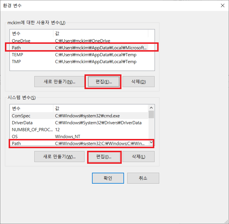 사용자 변수와 시스템 변수의 Path를 편집합니다.