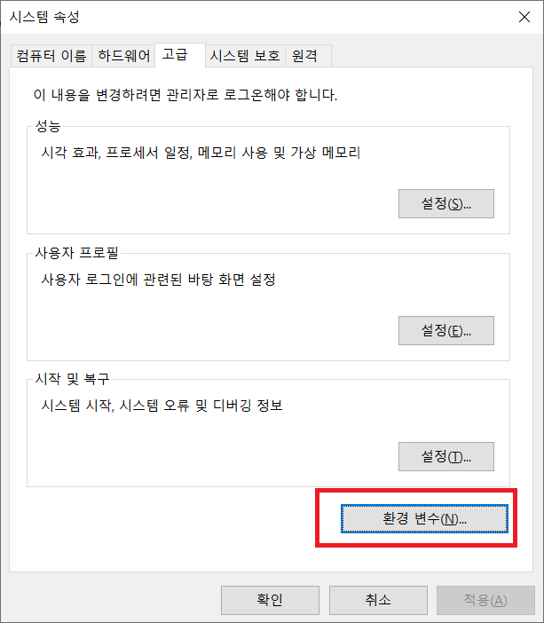 시스템 속성의 고급에서 환경 변수를 클릭합니다.