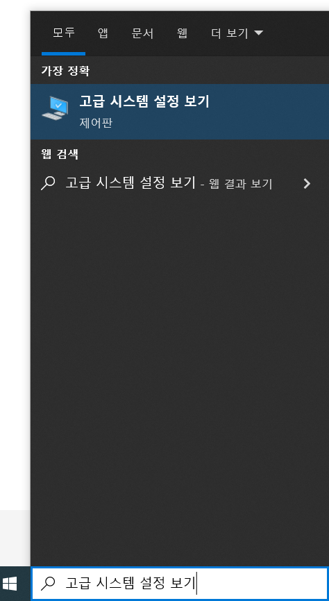시작에서 고급 시스템 설정 보기 를 검색해서 들어갑니다.