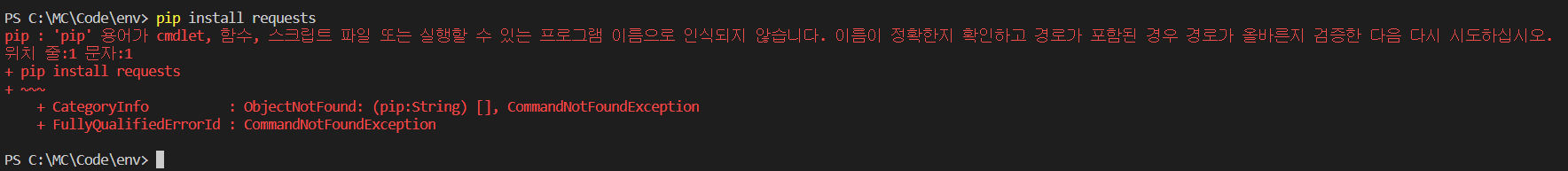 터미널에 pip install requests를 입력합니다. 하지만 아래와 같이 에러로그가 남습니다. 이유는 python을 설치하면서 다 설치되어 있는 pip, pip3의 위치를 찾지 못한 것인데요. 이제 환경 변수를 설정해보겠습니다.