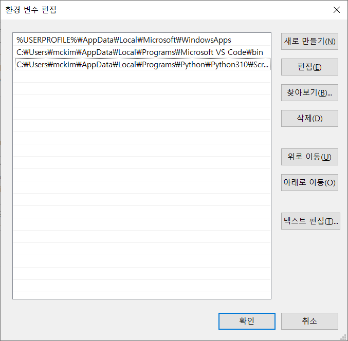 추가할 내용은 설치한 Python의 pip가 있는 폴더를 넣어주면 됩니다. 저는 Python3.10 버전을 설치해서 경로가 아래와 같습니다.